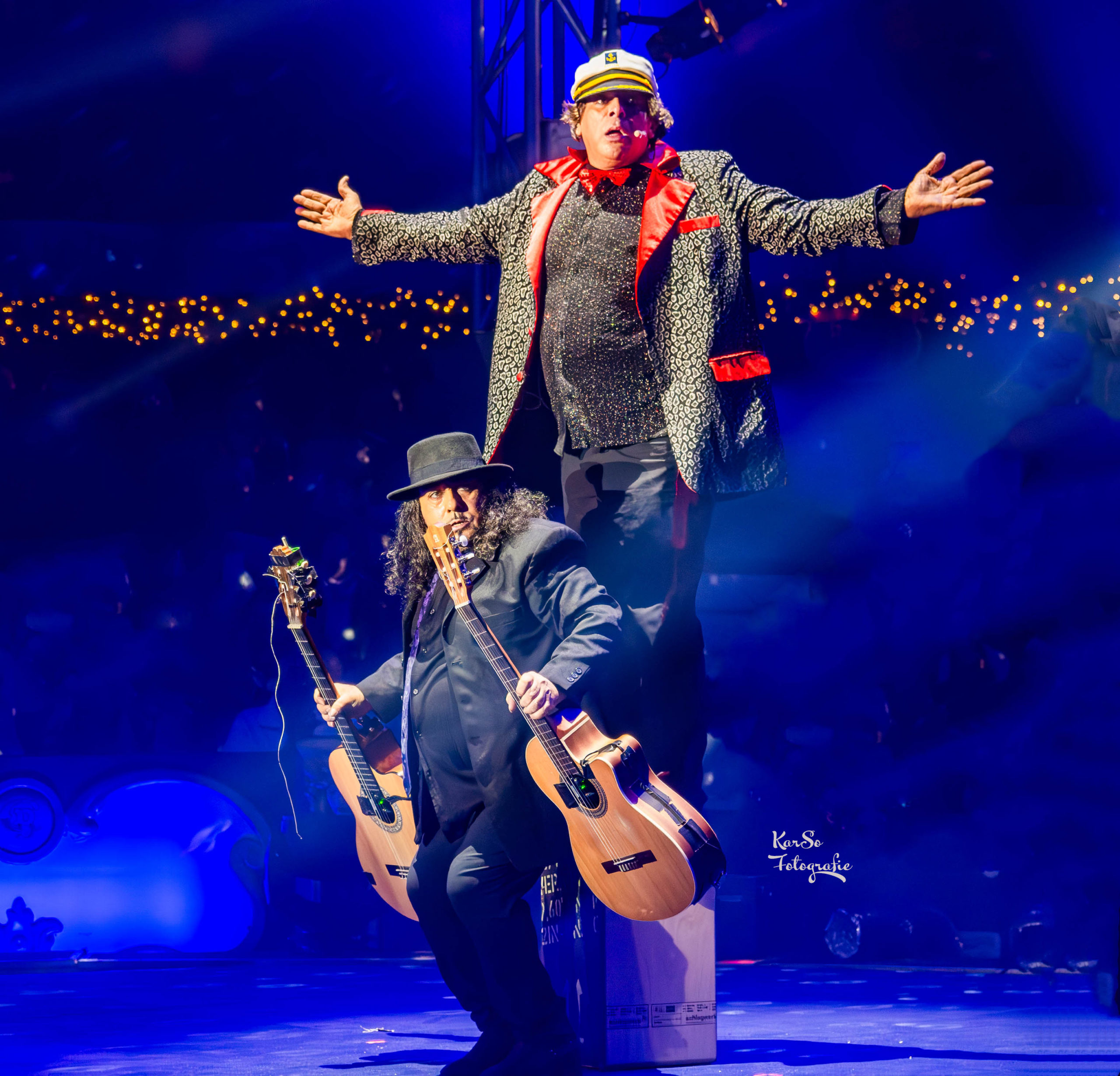Man könnte sie als die schrägste Mischung aus Gipsy Kings und Chaos Company beschreiben: Seit Jahrzehnten mischen der Amerikaner Paul Moroccos und seine Companeros Manegen und Bühnen mit ihren irrwitzigen FlamenComedy-Shows auf. Die lustige Musikusse Paul Moroccos  Marcial Heredia werden in Regensburg eine wilde Performance aus klassischem Flamenco, Chaos und Quatsch, gepaart mit Rhythmen aus Hardcore, HipHop und Drumbeat abliefern. Dabei sind die Instrumentalisten wahre Virtuosen – auf der Klampfe wie auch im Klamauk. Olé-Gründer Paul Moroccos verdiente sein erstes Geld als Straßenkünstler im Londoner Covent-Garden-Viertel, verliebte sich dort in  Flamenco- und Latin-Music sowie Rock’n’Roll-Rhythmen. Dass er ein begnadeter und begeisterter Jongleur ist, zeigt sich in allen Olé-Shows, wo kräftig jongliert wird – mit Tennisschlägern und Zitronen, Marcial und dem Publikum.