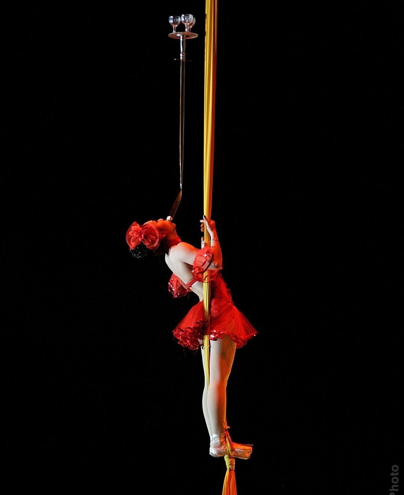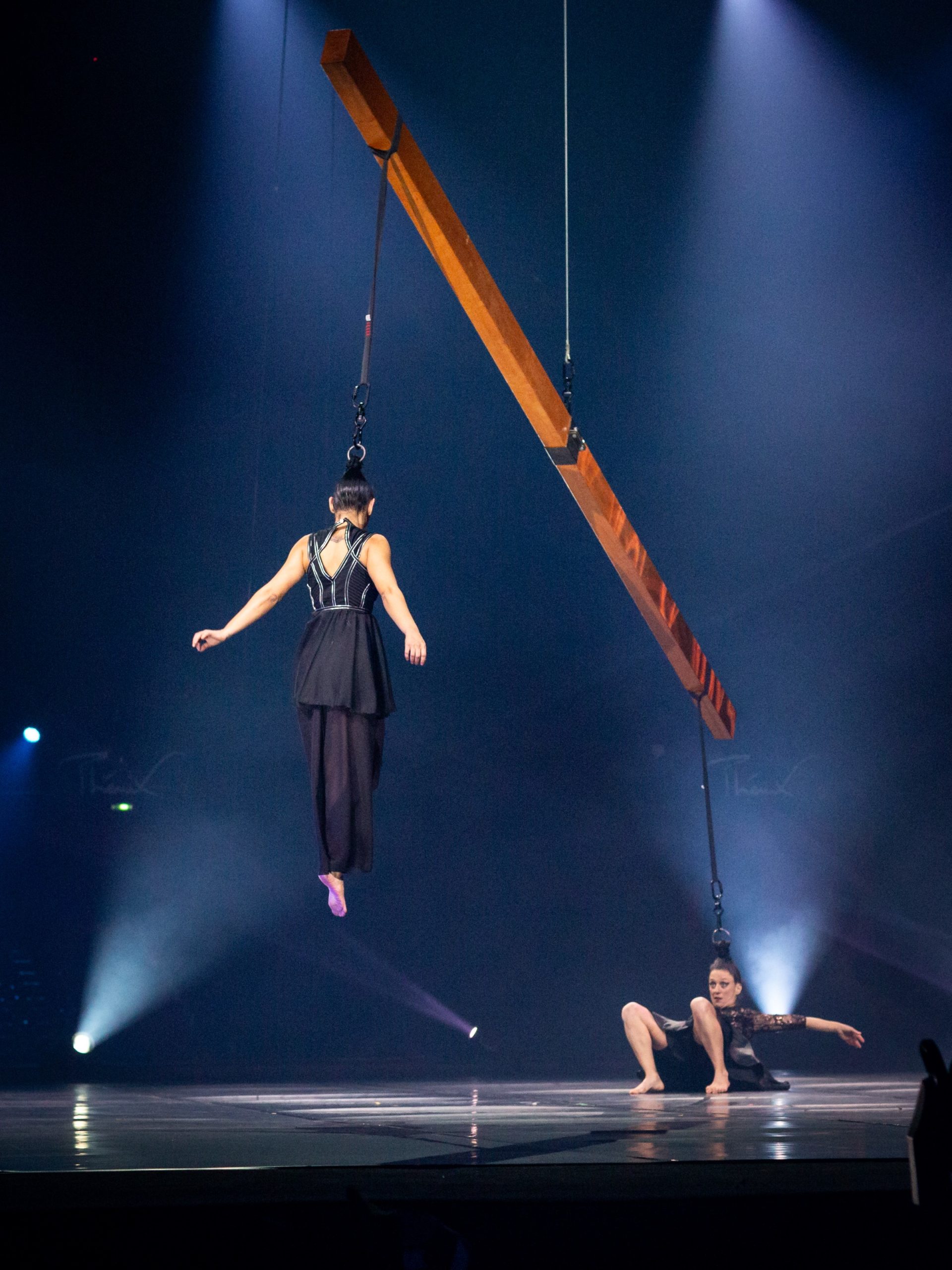 Man könnte ihren Flug mit dem der herrlichen Hexen in einem Goya-Gemälde vergleichen, man könnte das haargenau abgestimmte Auf und Ab wie das Abbild unserer Existenz ansehen, auf jeden Fall ist die ungewöhnliche Kunst von Ricce Meticce einfach haarsträubend. Beim letztjährigen Festival Cirque de Demain Paris sorgte das Duo für begeistertes Kopfschütteln und großen Jubel. Die italienischen Artistinnen Chiara und Samanta haben die uralte Kunst des Zopfhangs wiederentdeckt. Dazu kommt noch, dass die Hängepartie der zwei an diversen italienischen, spanischen und französischen Circus Akademien ausgebildeten Künstlerinnen an einer hoch in die Luft gehenden Art Wippe vonstattengeht. Ihre wilde Lockenpracht (frei übersetzt vom italienischen Ricce Meticce) wird dafür zu einem Pferdeschwanz getürmt, in dem ein dicker Ring für den Abflug fixiert ist – diese Frisur muss mindestens wie Dreiwetter-Haarspray halten! Viel Kraft und Körperbeherrschung sind für all die akrobatischen Figuren nötig, hält hier doch quasi das Haupt den ganzen Körper und all seine Bewegungen aus. Das könnte einem schon ganz schön Kopfschmerzen bereiten.